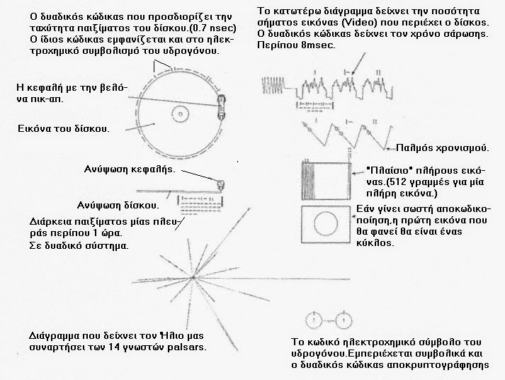 Ένα από τα οπτικά μηνύματα που μεταφέρουν τα ανωτέρω διαστημικά οχήματα. Στην εξωτερική πλευρά, ενός των οχημάτων έχει επικολληθεί χρυσή πλάκα με τα ανωτέρω σχέδια. Η σημασία των σχεδίων εξηγείται ως εξής: (A) Στο σχέδιο αυτό αποτυπώνεται το ηλεκτροχημικό σύμβολο του υδρογόνου Η2. (Β) Στο σχέδιο αυτό αποτυπώνονται ένα ζευγάρι γήϊνων, όπου ο άντρας έχει σηκωμένο το χέρι του σε στάση χαιρετισμού. (Γ) Αποτυπώνεται η μορφή του οχήματος. (Δ) Το διάγραμμα αυτό προσδιορίζει την θέση του Ήλιου μας, χρησιμοποιώντας τις 14 γνωστές διευθύνσεις 14 γνωστών pulsars σε σχέση με τον Ήλιο μας. (Ε) Το σχέδιο αυτό δίνει την έννοια του πλανητικού μας συστήματος και την θέση της Γης, από όπου εκτοξεύτηκε το διαστημικό όχημα.